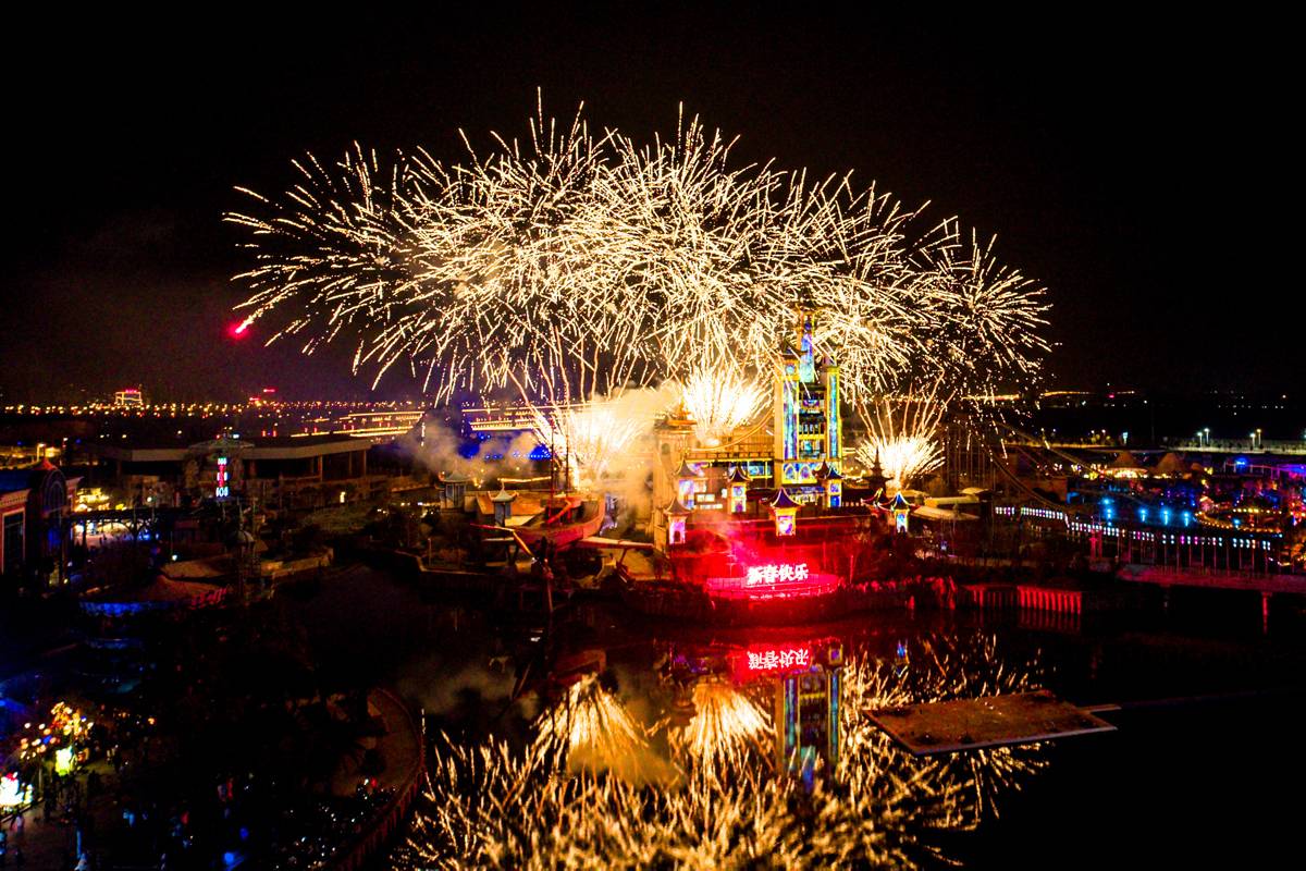 作为本次新春活动的重头戏,“奇梦城堡烟花光影秀”从大年初一至正月十五,持续15天燃放。夜幕降临,“星云会馆”城堡在数万名游客的期待中化身巨型光影画布,将古城墙的沧桑、诸葛亮的智谋、米芾书法的神韵、金庸笔下郭靖守城的侠义精神徐徐展现,襄阳2800年历史文脉呼之欲出,伴随如星河倾落的绚丽烟花,点亮城市夜空。更融合国家级非遗“水上火龙钢花”,当炽热的铁水被击打升空,瞬间化作漫天璀璨的金色星雨,部分铁水洒落湖面,激起一片跳跃的“火树银花”,与城堡光影、空中烟花共同构成“水、陆、空”三维交织的视觉奇观。现场惊叹声与快门声此起彼伏,许多家庭游客驻足良久,父母将孩子扛在肩头,共同记录这震撼一幕。