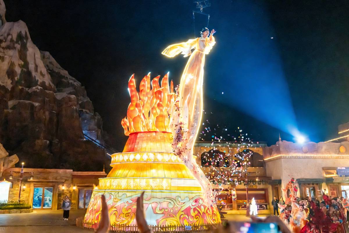 全新策划的演艺活动日夜接力。日间,“八方来财大巡游”热闹非凡,巨型花车与演员沿主环道行进,沿途派发祝福,吸引众多家庭簇拥跟随、互动合影;在“深海探秘”海洋馆,独创“大展鸿图水下舞狮”,灵动的“金狮”在水中完成高难度动作,引得孩子们连连拍手叫好;由智能机器人矩阵演绎的AI“非遗迎客鼓”表演,则将现代科技注入传统节庆。