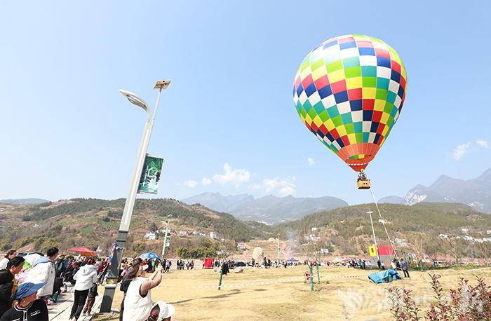 矗立在草坪上的七彩大型热气球格外引人注目,它色彩斑斓,宛如一道绚丽的彩虹,在蓝天白云的映衬下更显得光彩夺目。随着热气球缓缓升起,现场人声鼎沸,十分热闹,俯瞰整个神农湖,景色美不胜收,令人心旷神怡。