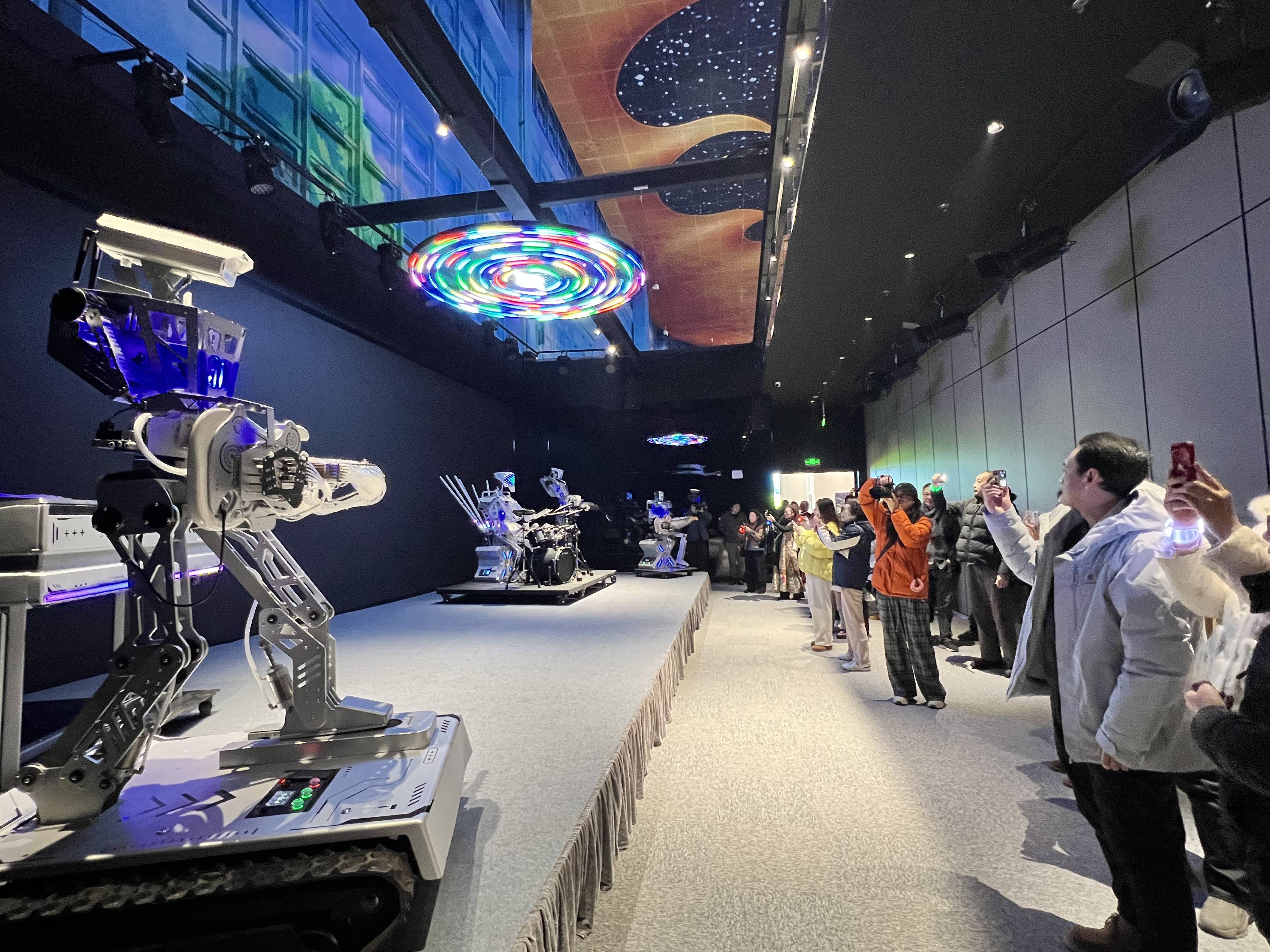 场馆内,有首次在武汉亮相的春晚同款魔法原子机器人,为游客娓娓道来武汉的各种文旅知识;曾五次登陆央视、国内少有的整套乐队机器人,在现场奏响电音热浪;还有曾和王力宏同台演出的跳舞机器人,以及机器狗、四轮机器人等齐聚一堂,游客皆可亲身体验。“这阵容,堪比机器人界春晚。”胡伟感叹。
