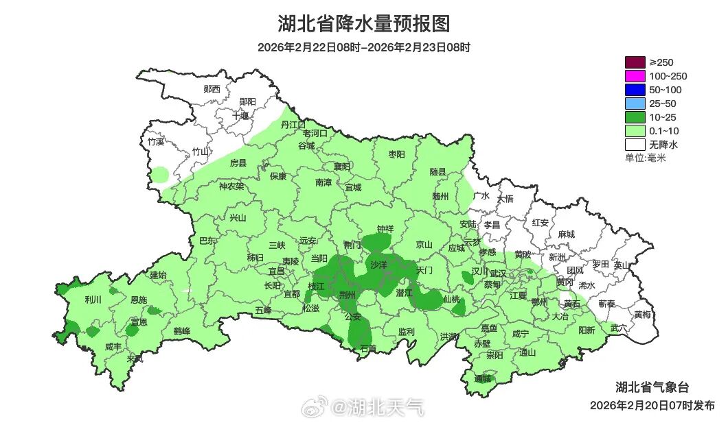2月23日08时-24日08时,全省阴天有小到中雨,其中鄂东南局地大雨、鄂西北高海拔地区有雨夹雪。最高气温北部8~13℃、南部13~17℃,最低气温鄂西北2~5℃、其他地区5~10℃,偏北风3到4级、阵风5到7级。