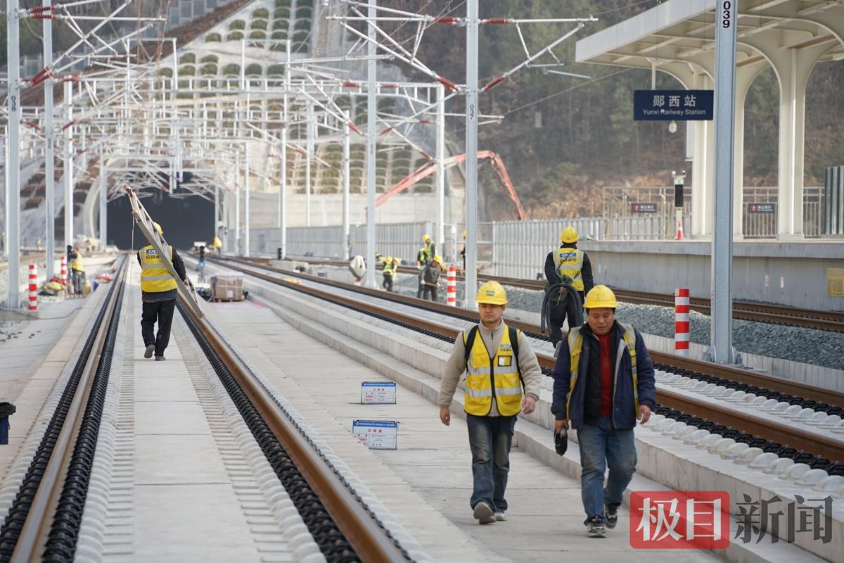 距离小镇不远的郧西站房施工现场,同样热火朝天。站房二楼机电调试区域,工人们推着物料穿梭往来,脚步声、工具碰撞声、设备运行声交织成有序的建设交响曲。