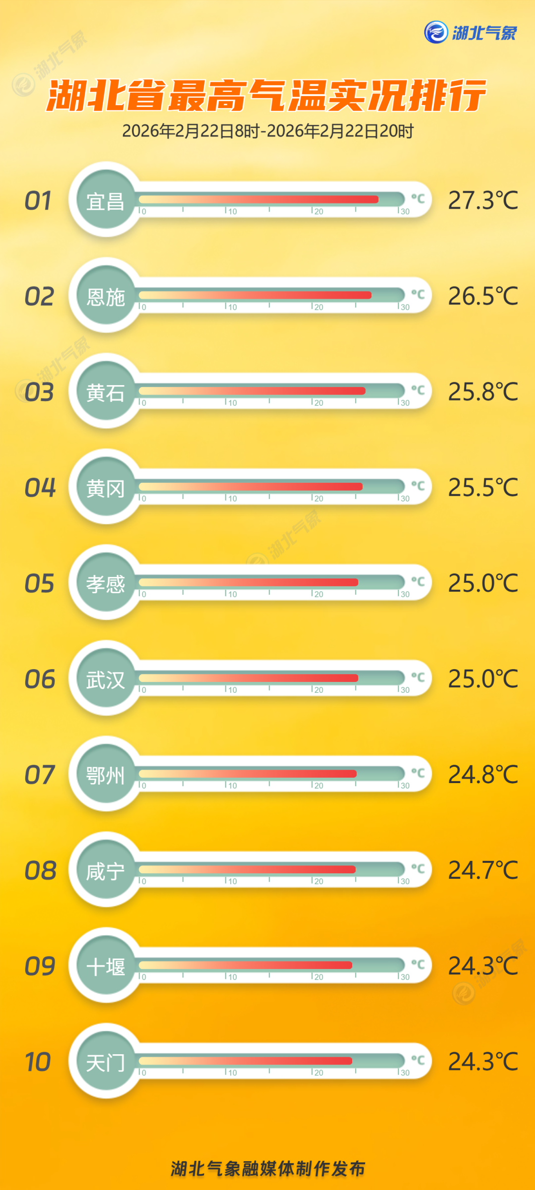 鄂西北、江汉平原北部阴天转小雨;其他地区阴天转小到中雨。最高气温鄂西北9~13℃、其他地区13~19℃,最低气温4~10℃,偏北风2到3级。