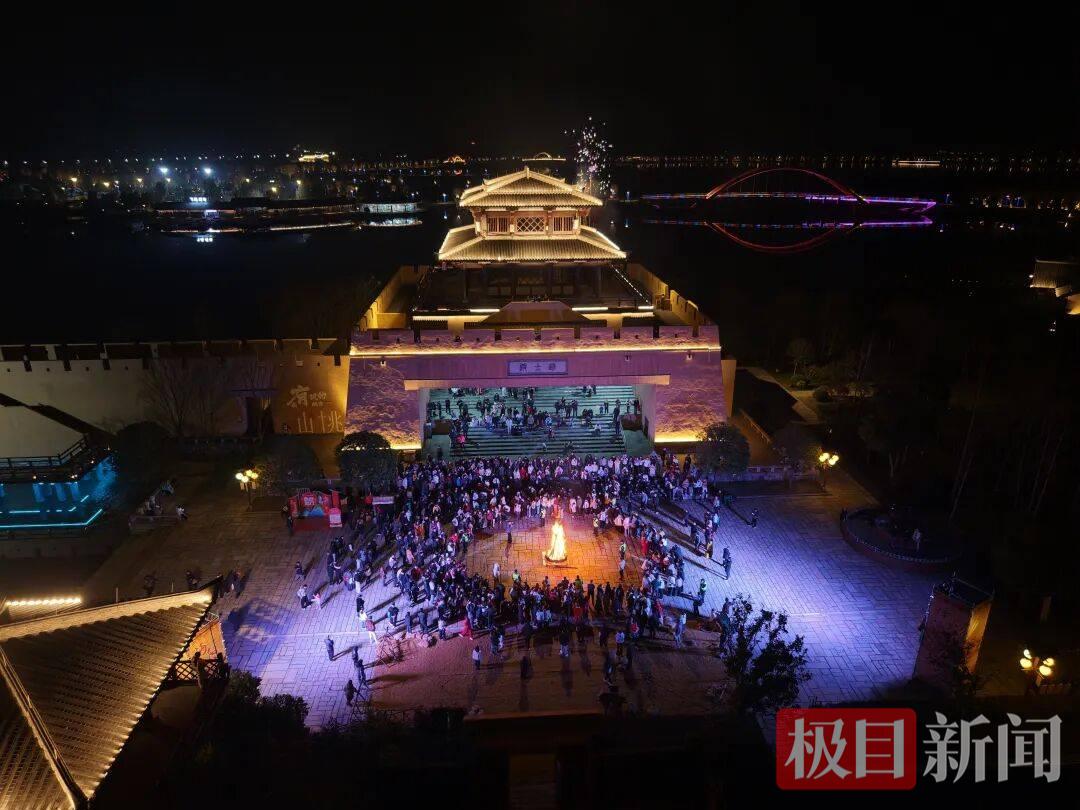 夜幕降临,千盏灯笼次第亮起。商业街人声鼎沸,沔阳三蒸、邱记锅盔、鳝鱼粉、毛嘴卤鸡等地道美味香气四溢,家人围坐一路逛吃。进士殿广场上,熊熊篝火燃起,人们手拉手围火共舞,水上烟花秀璀璨绽放,岸边站满了抬头仰望的游客。