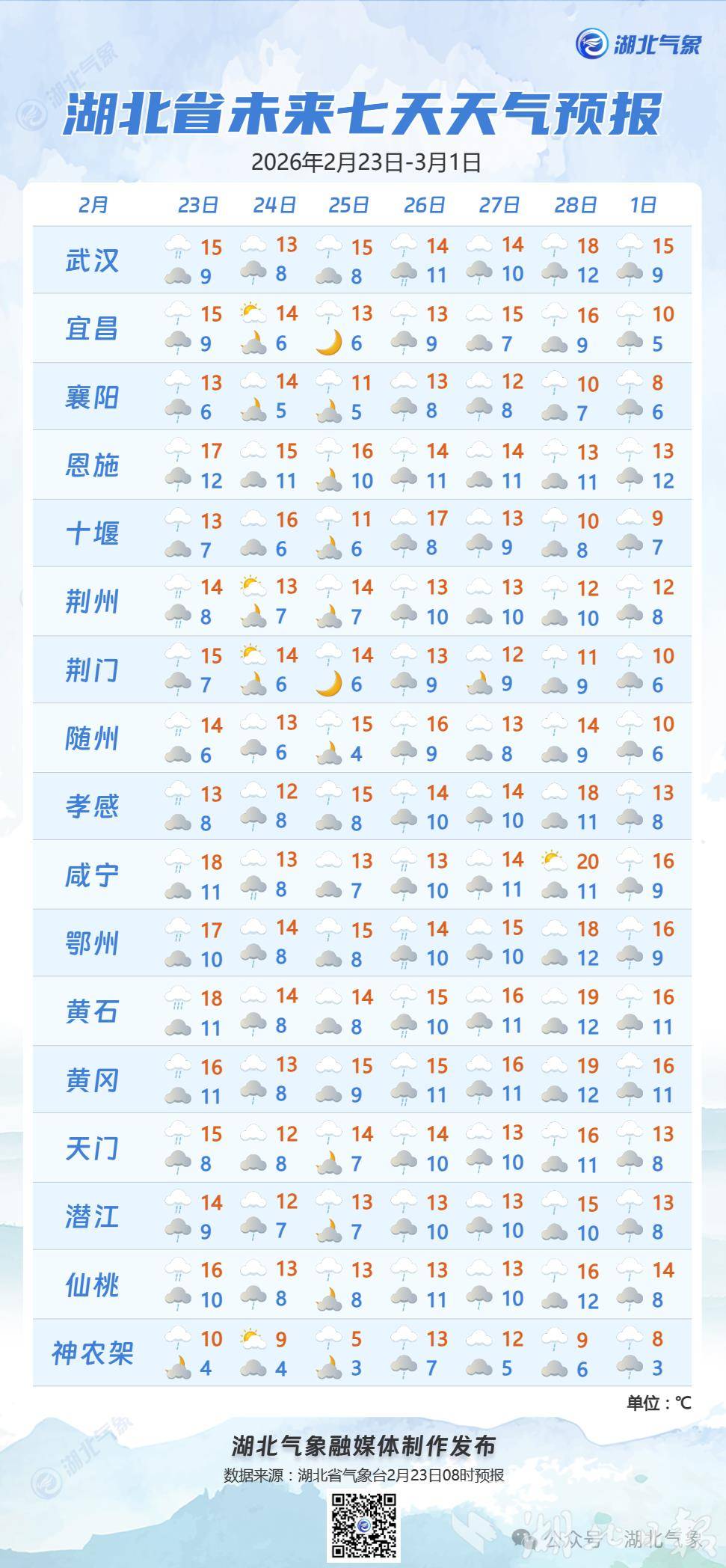 气象专家介绍,23日有降雨和大风降温,偏北阵风6至7级、局地8级,其中鄂东地区有中到大雨、单点暴雨,其他地区以小到中雨为主,神农架有雨夹雪,南部地区伴有雷电,最高气温从22至27℃降至11至16℃。预计24日有降雨间歇,最高气温西部14至19℃、中东部11至14℃。25日起至26日,新一轮降雨来袭,全省又将有小到中雨出没,25日最高气温鄂西北9至13℃、其他地区13至19℃。预计27日夜间至3月1日,省内仍有阴雨天气。