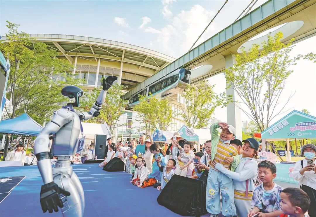 2025年5月1日,在武汉光谷空轨高新大道站,人形机器人与游客互动。(湖北日报全媒记者魏铼摄)