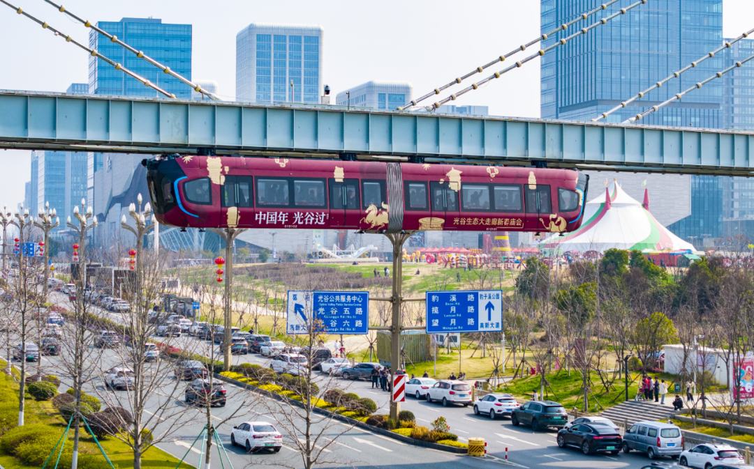 2月19日,大年初三,全面换装的光谷空轨新春主题列车,满载游客穿行在中央生态大走廊上空。(记者 魏徕 摄)