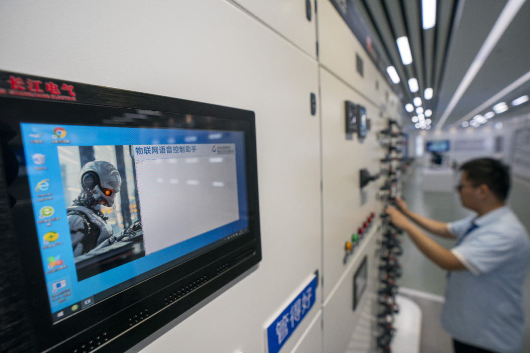 工程师正通过语音指令测试新一代智能电气柜。(记者 魏徕 摄)