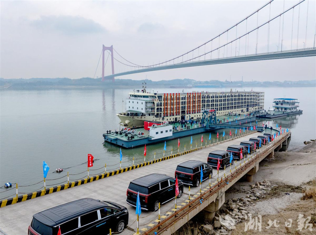 2月10日,黄石港棋盘洲港区10号滚装泊位正式开港,首批18辆“黄石造”长城汽车通过“民贵”号滚装船发往重庆,实现该品牌首次在黄石经水运外销。(视界网 石勇 摄)