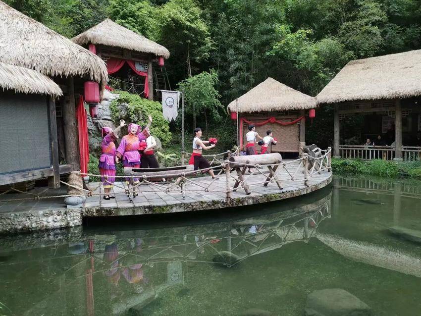 飞瀑流泉畔,红灯笼次第高悬,天生桥景区的山水画卷美得如梦似幻。传统作坊区内,《神农架梆鼓》的震天鼓声、《叭一口》的悠扬歌声、《南桥戏水》的灵动舞姿轮番上演,本土艺人的精彩表演赢得阵阵掌声,游客们纷纷驻足观赏,不少人跟着节奏拍手叫好。
