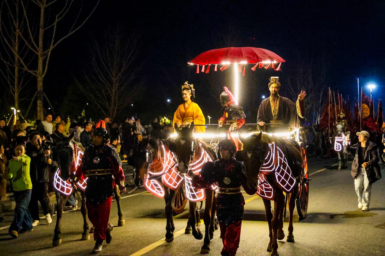 正月初五晚,荆州楚文化数字产业园里灯光璀璨。雄浑的号角声响起,“荆州十二时辰·楚乐八百年”大型实景演出拉开序幕。活动相关负责人介绍,演出以沉浸式剧情为核心,串联起大戏、非遗、互动等内容。