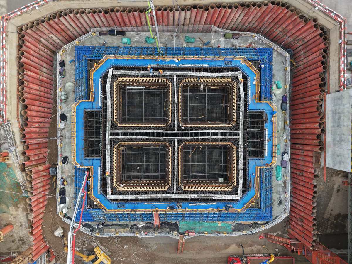 此次浇筑的是大桥7号主塔塔座及第一节下塔柱。其中,塔座设计为四棱台结构,底部尺寸为34米×30米、顶部尺寸为28 米×24米、高3米,混凝土方量为2538立方米;第一节下塔柱横向宽度为22.362米、纵向宽度为20米、高度3米,混凝土方量为818立方米。