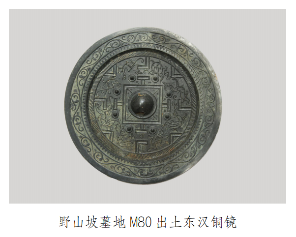 野山坡M90 带壁龛的长方形土坑竖穴墓。墓圹斜壁平底、口大底小。墓口南北长3.1米,东西宽1.74米-1.8米,墓底距墓口深2.4米。一棺一椁,残存朽痕。人骨保存较差,依形骸判断为仰身直肢葬。南壁下设壁龛,长0.81米、高0.32米、进深0.12米,内置铜镜1件。椁内头厢出土玉壁1件,棺内出土铜剑1件。
