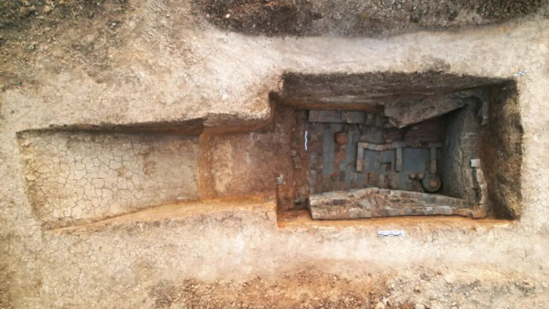 晏坡墓地M5双室墓。方向4°。砖室建造在竖穴土坑中,墓圹边缘清晰。由墓道和墓室两部分组成,墓道位于北侧,墓室位于南侧,二者以墓室封口砖墙相连接,平面呈“凸”字型。墓室为双室,均为券顶。墓口长11.05米、宽6.16米。两墓室均被盗扰,盗洞均打通墓室顶部直至墓室。