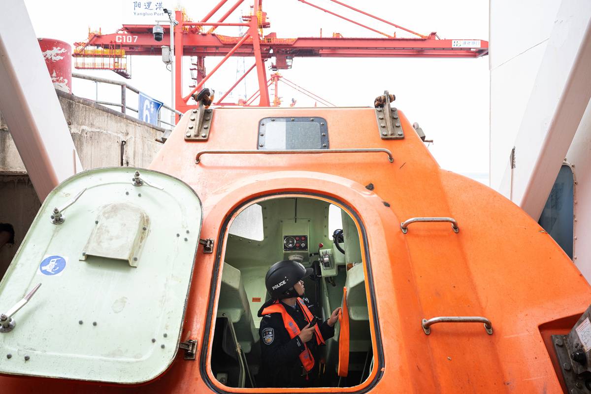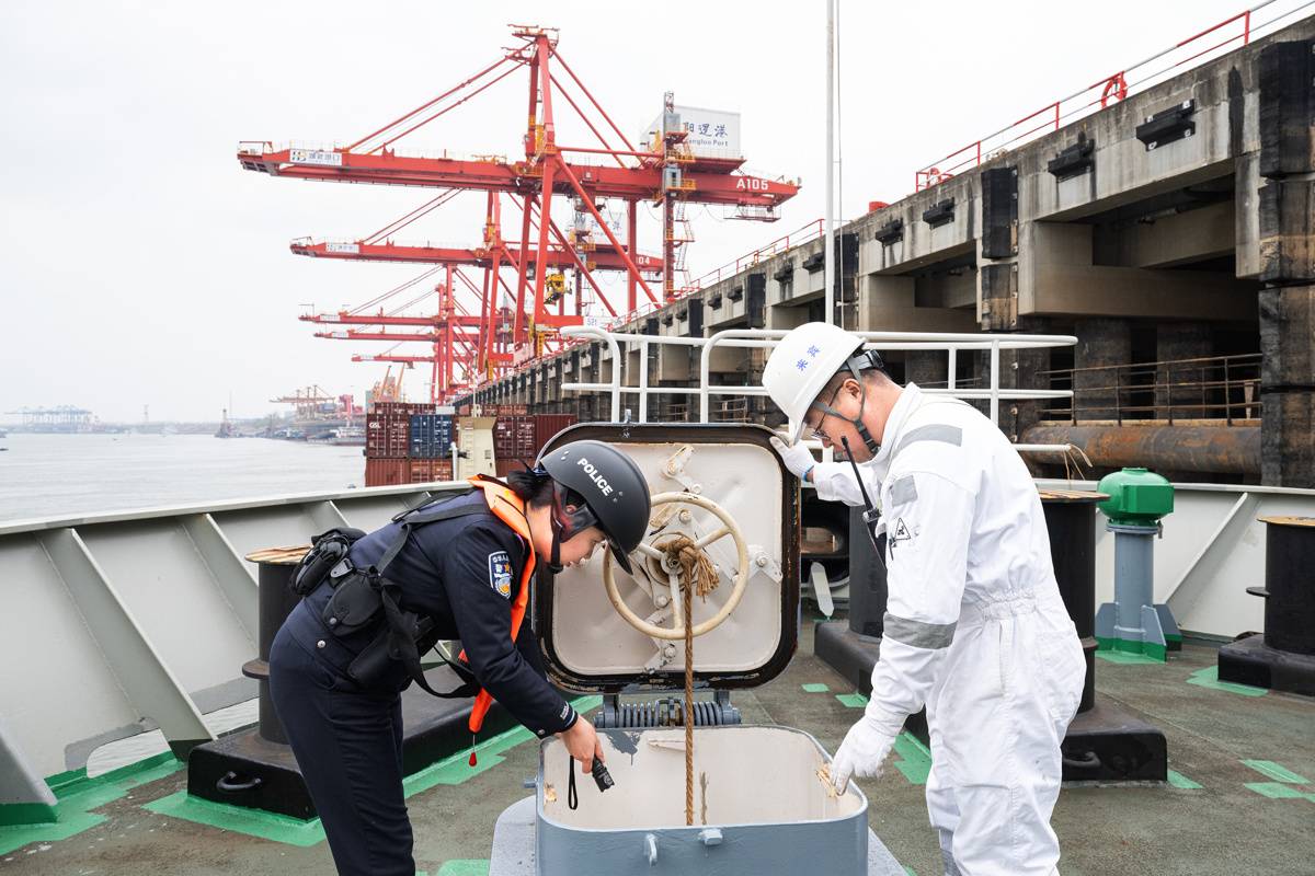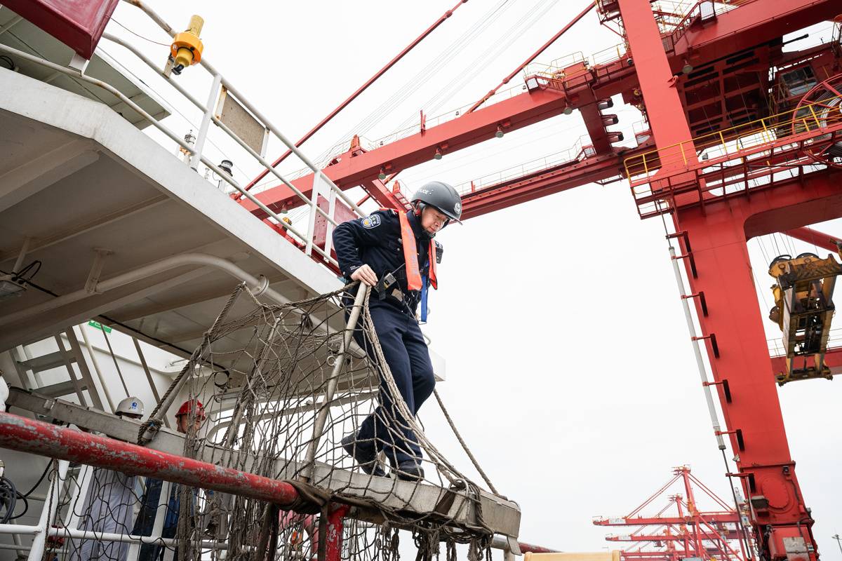 2月25日,在武汉阳逻港国际集装箱码头,汉口出入境边防检查站民警登上“华航汉亚5”轮进行例行检查。(湖北日报全媒记者任勇通讯员胡艳摄)