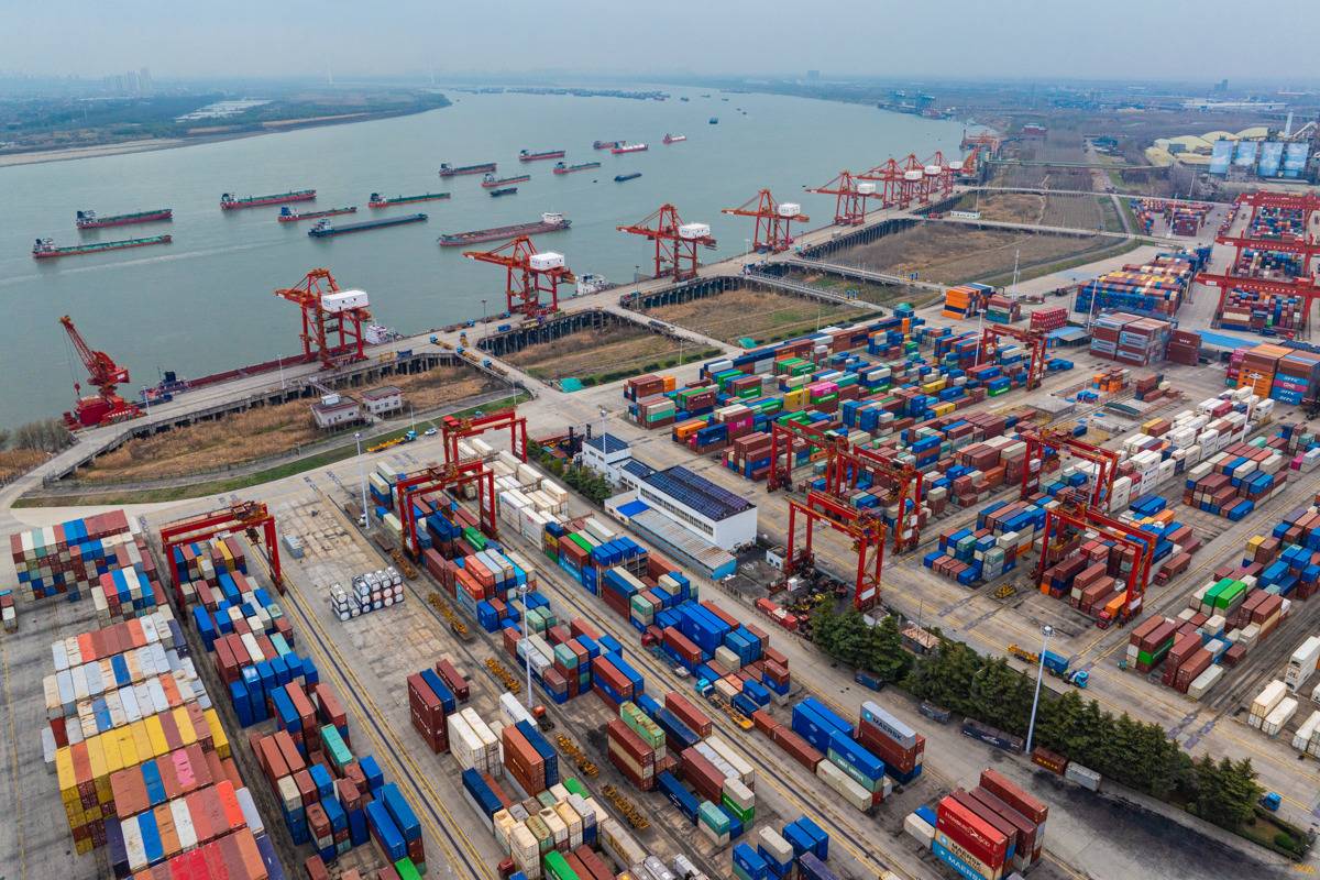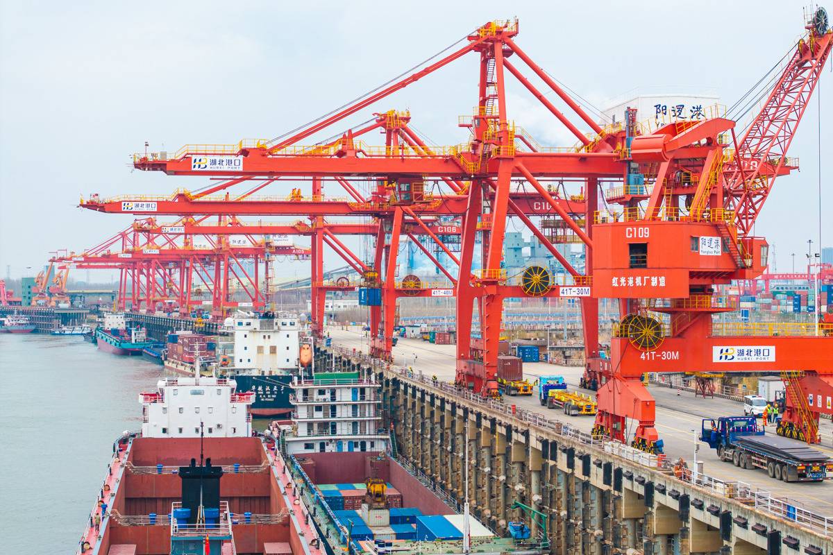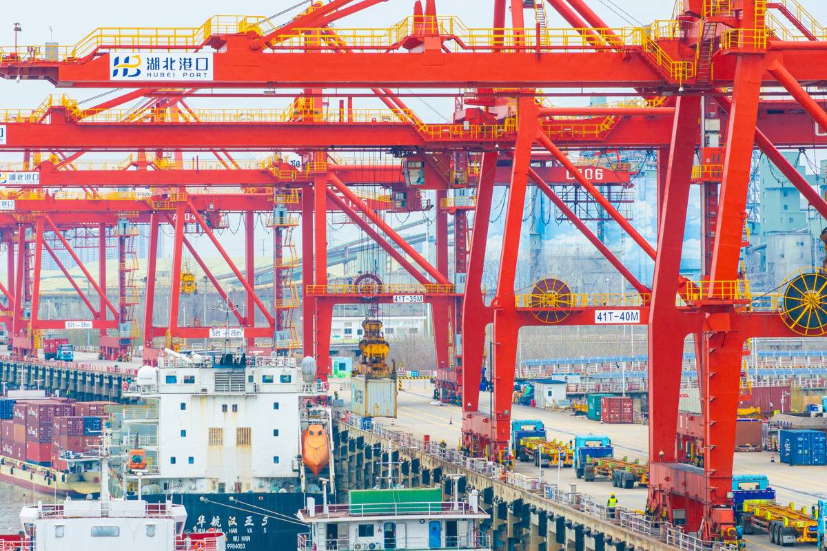 2月25日,武汉阳逻港国际集装箱码头迎来春节假期后的新一轮作业高峰,码头上一派繁忙。(湖北日报全媒记者任勇通讯员胡艳摄)