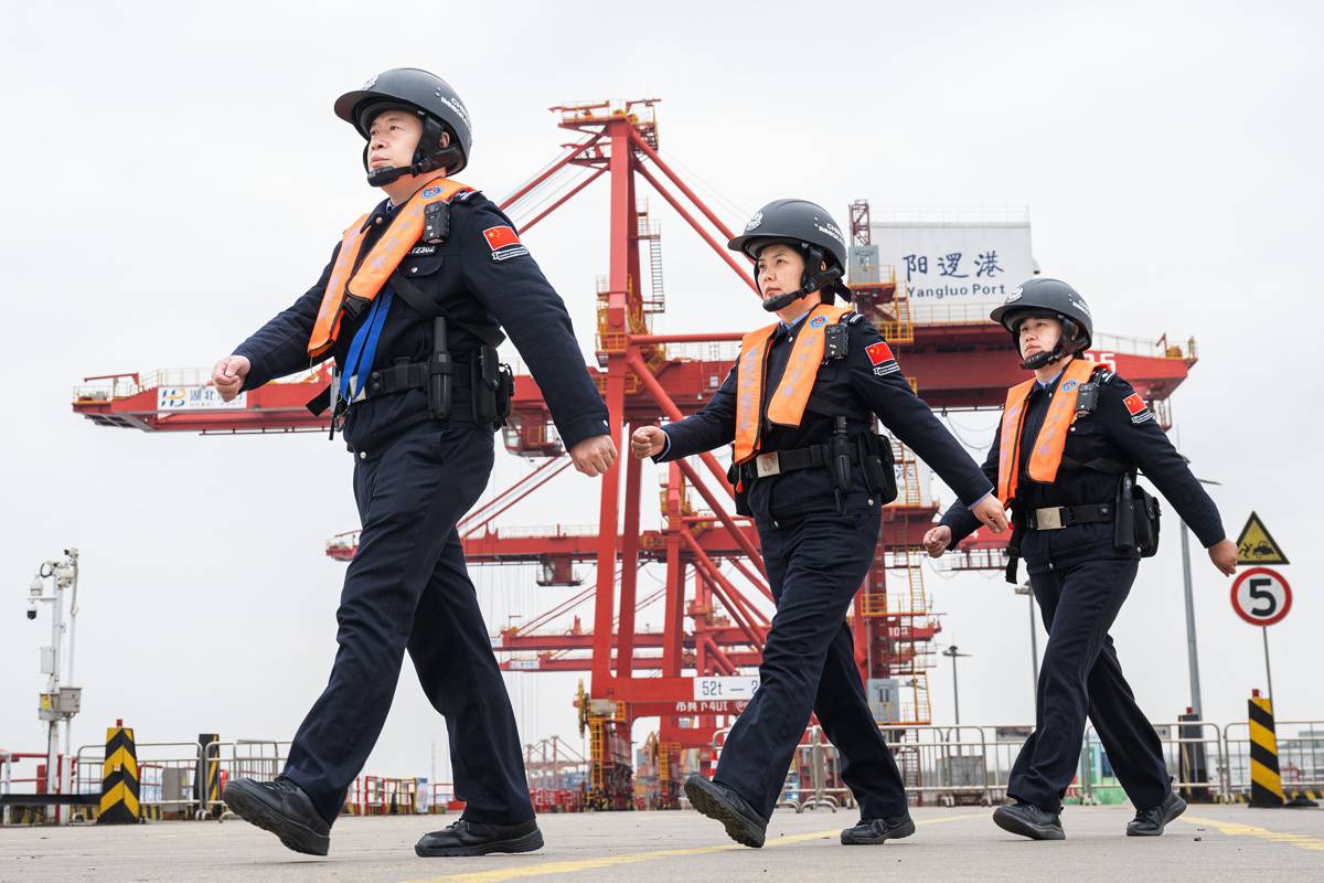 2月25日,在武汉阳逻港国际集装箱码头,汉口出入境边防检查站民警登上准备从武汉出境的“华航汉亚5”轮进行例行检查。近日,武汉阳逻港国际集装箱码头迎来春节假期后的新一轮作业高峰,多艘船舶同时停靠,码头上一派繁忙景象。2月24日,由日本名古屋驶来的“华航汉亚1”船舶顺利靠泊武汉阳逻港,这也是丙午马年长江中上游迎来的首艘江海直航入境船舶。(湖北日报全媒记者任勇通讯员胡艳摄)