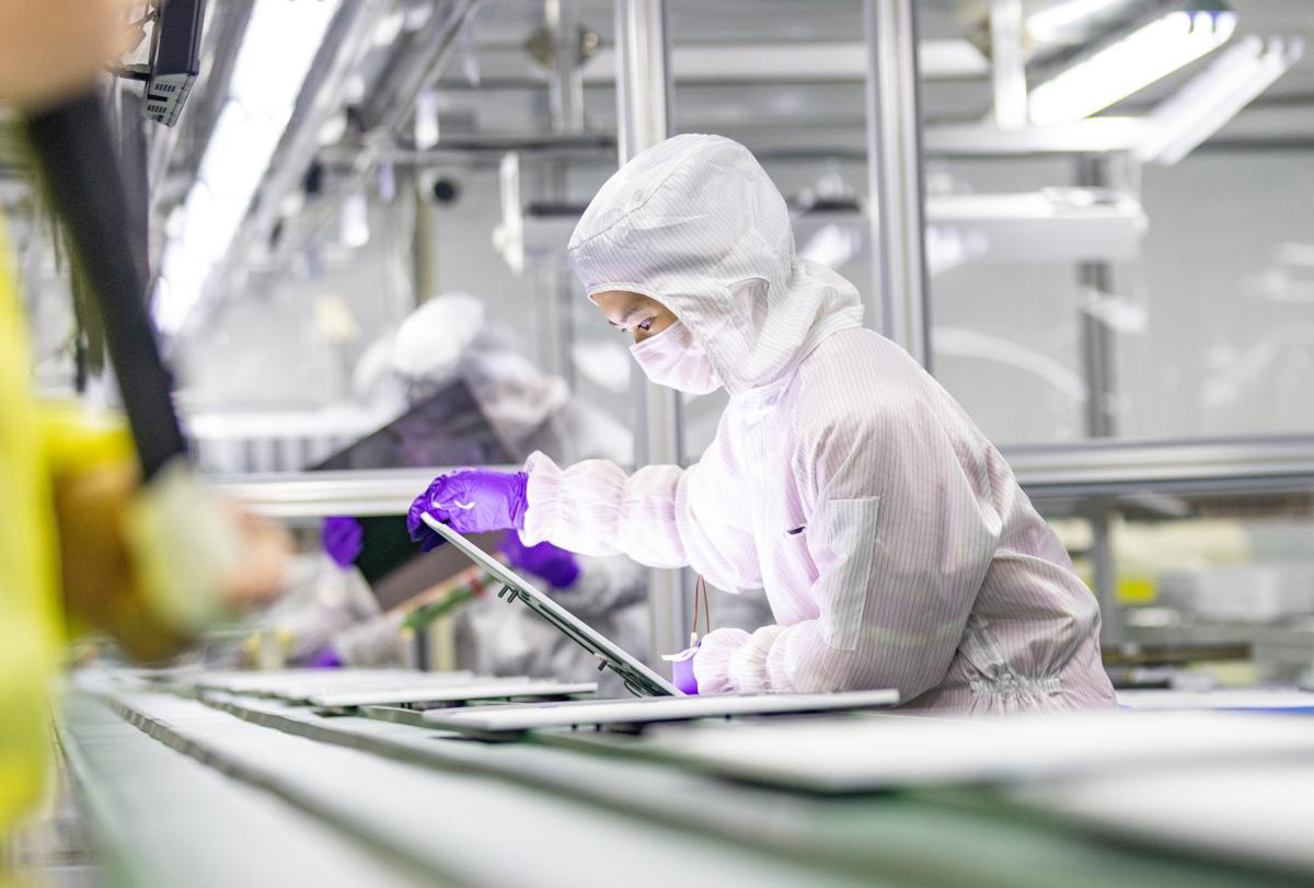 彤辉智能科技天门有限公司LCM无尘车间内,工人们正在加紧安装显示模组