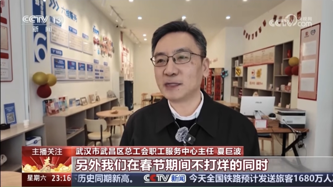 近日,央视新闻频道报道了武昌区黄鹤楼街道工会驿站在春节期间持续开放、服务,户外劳动者与外地游客的暖心举措。