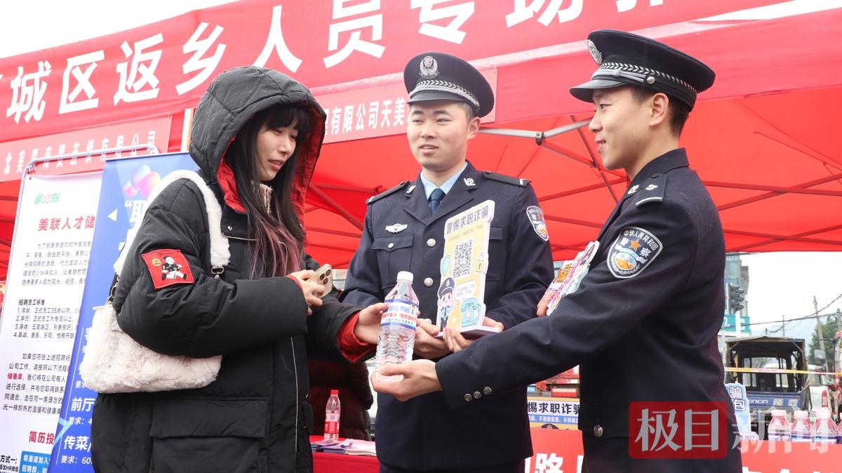 “欢迎扫码关注襄城公安官方微信账号‘襄城警事’,我们会持续更新针对最新诈骗手段的防骗技巧,还有我们民辅警自己拍摄的反诈小短片供您浏览!”反诈民警们将微信二维码做成小立牌,请来往求职者扫码观看,将各类反诈标语印成贴纸贴在矿泉水上,向求职者发放,营造全民反诈良好气氛。