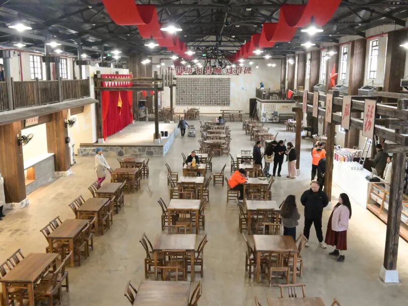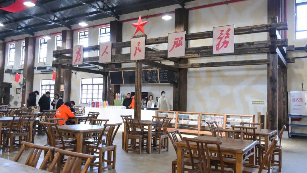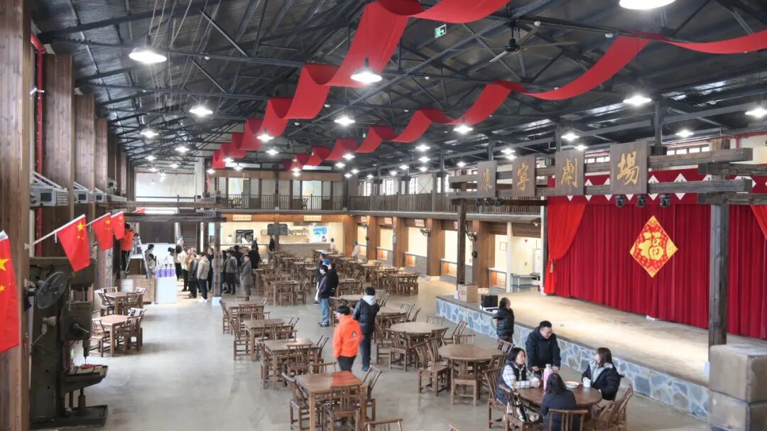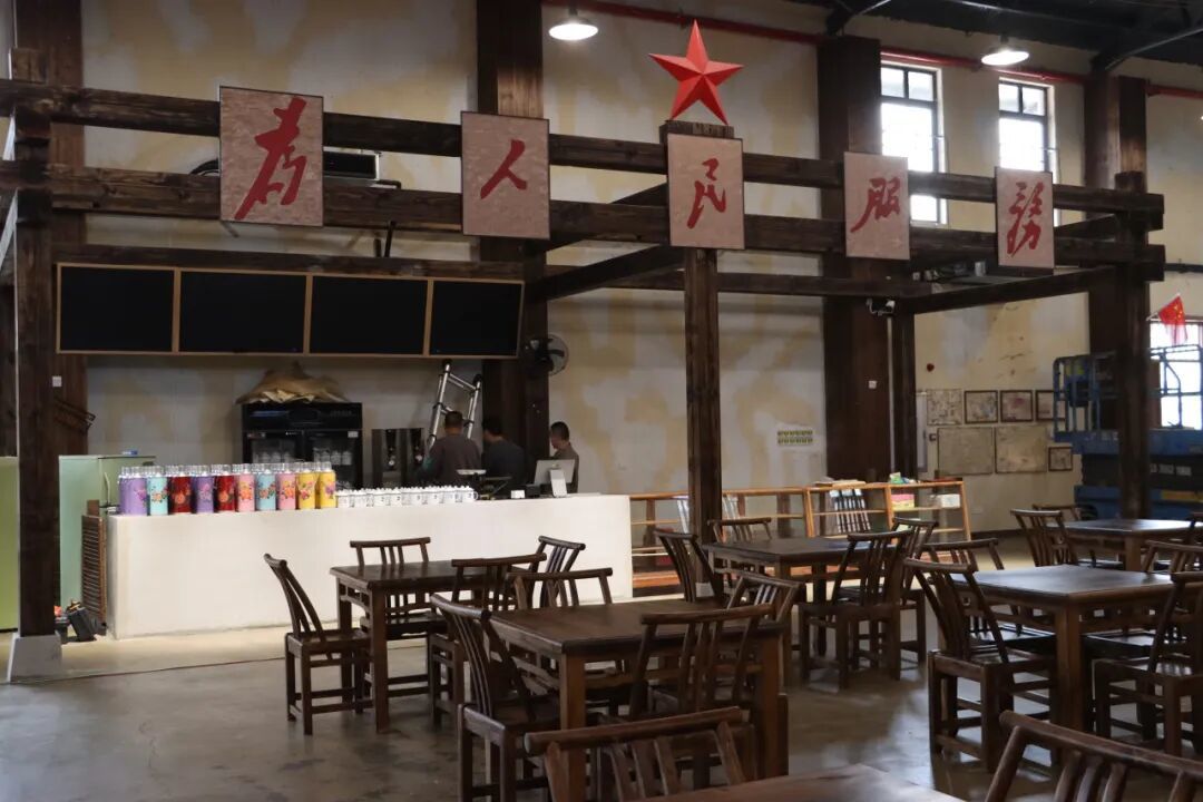 远远望去,茶馆主体建筑并未刻意粉饰,而是选择保留了厂房原有的钢结构与斑驳的砖墙。墙面上,“改造思想、指导实践”“至诚至信、求精求效、创高创新”等红色标语依旧遒劲有力,而“茶管够、饭管饱、心管暖”等亲切口号,则巧妙地将工业生产的冷峻转化为市井生活的温情。