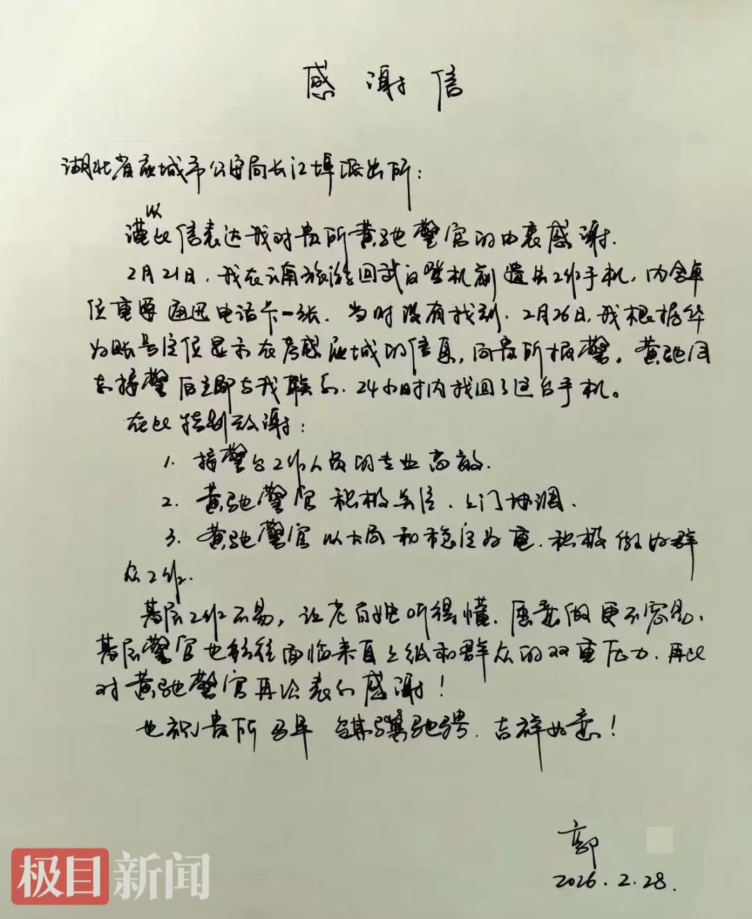 近日,湖北省孝感应城警方成功处置一起跨省遗失手机求助事件,民警凭借细致排查、耐心走访,快速为远在外地的群众找回遗失手机,失主特意手写感谢信,向民警表达诚挚谢意。