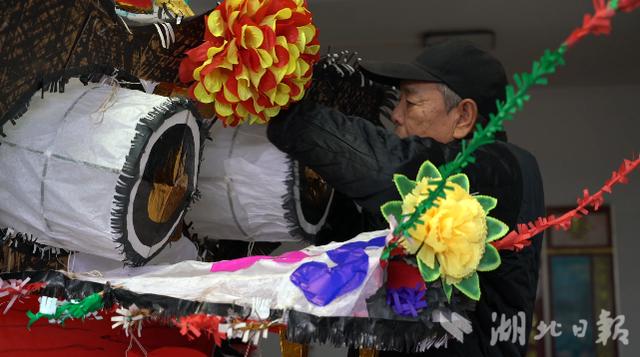 大新镇大新村的舞龙队队员们也在紧锣密鼓地忙碌着,糊宣纸、贴剪纸,分工协作、有条不紊。刘秀芳剪制的各类剪纸饰品,正是龙灯最亮眼的“外衣”。龙头的耳扇、金蟾,到五彩云、桂花牵藤纹样,每一处都精心设计、细致剪裁,既保留了传统剪纸的古朴韵味,又贴合龙灯的喜庆寓意,让原本朴素的龙灯变得鲜活灵动。大新镇大新村舞龙队队员殷修文说:“我们今天扎的龙灯身上有金蟾、五彩云,还有大绣球、各种颜色的彩花,每一处装饰都寓意着好彩头。希望新的一年风调雨顺、日子红火。”