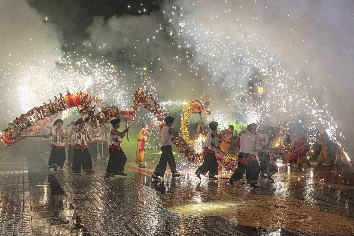 赛场上,省级非遗项目“花坪火龙”的表演最为夺目。74岁的非遗传承人吴际安与14岁的少年黄现龙老少携手,带领队伍同场竞技。特制花筒喷射出的冷焰火与蓝烟交织,火龙翻腾间火星璀璨,将千年民俗的独特魅力展现得淋漓尽致。