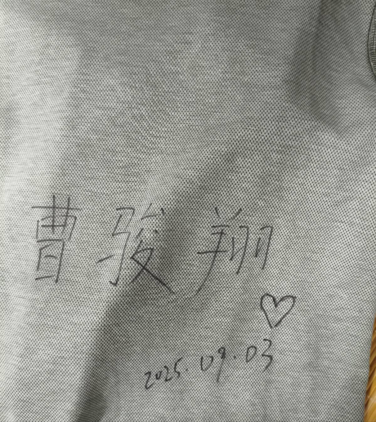 9月3日,出发去天安门前,罗书荣将爱人曹骏翔的名字写在了当天穿的体能服上