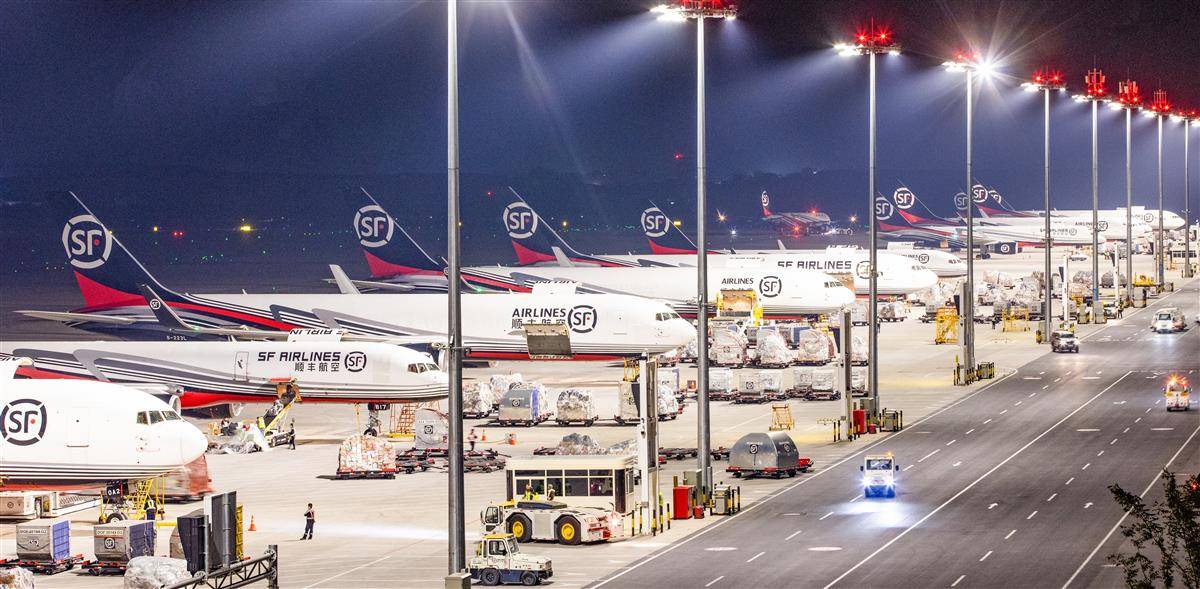 凌晨,鄂州花湖国际机场停机坪,全货机依次排开,运输货物的拖车穿梭往来。(湖北日报全媒记者 薛婷 摄)