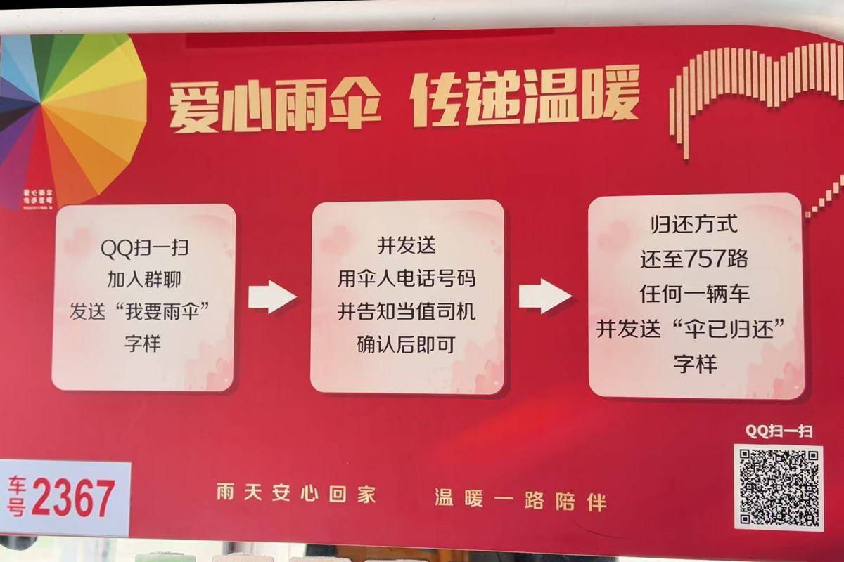 据了解,“爱心雨伞”的借还流程十分便捷。乘客遇雨天忘带雨伞时,只需扫描驾驶室背面宣传海报上的二维码,加入“暖相随”QQ群,留下姓名和电话,即可免费领取使用;归还时,无需特意寻找借伞车辆,将雨伞送到任意一台757路公交车上,并在群内发送“伞已归还”字样即可。截至2026年2月的4年时间里,757路共借出爱心雨伞2600余次,雨伞归还率达98%以上。