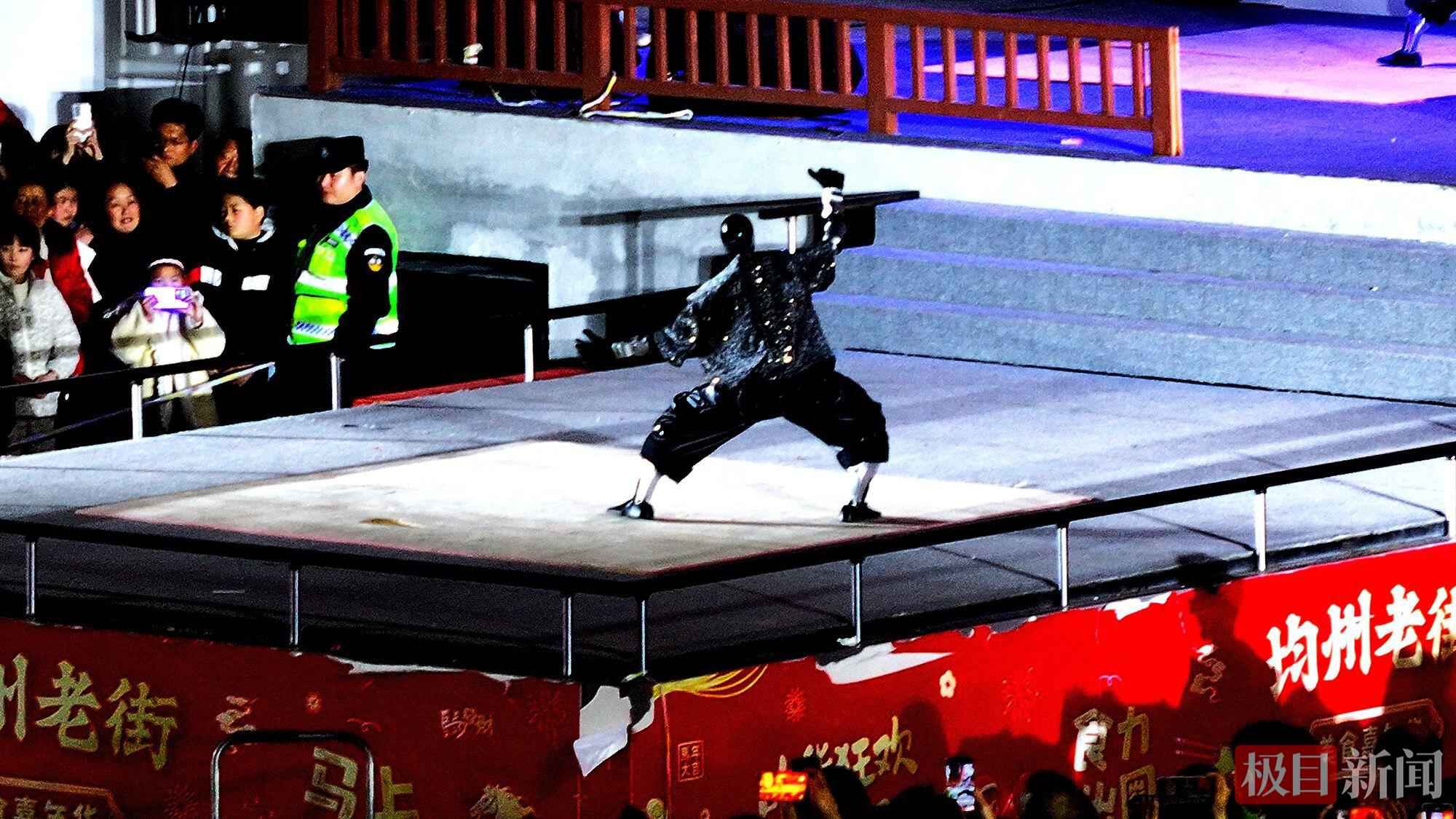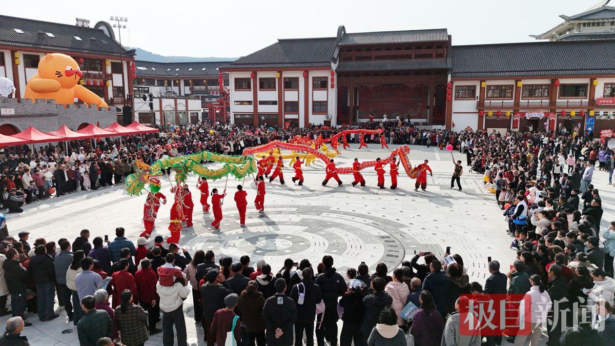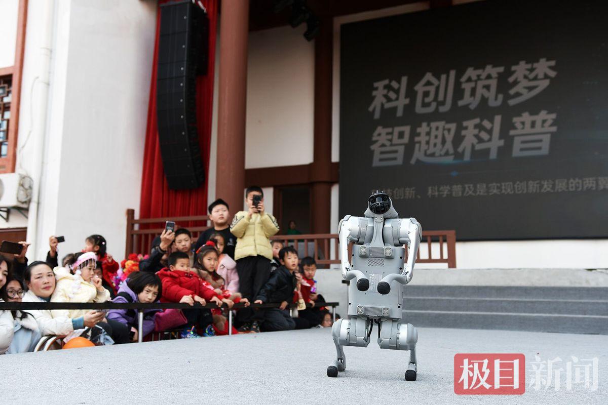 人潮涌动、笑语喧天。下午三时起,太极广场上,四条彩色巨龙翻腾飞舞、气势磅礴;旱船摇曳、蚌壳舞灵动、抬花轿充满喜庆、赶毛驴风趣诙谐,多组经典民俗同台狂欢,尽显非遗韵味。灵动的机器狗向观众作揖拜年,极大地吸引了孩子们的目光,瞬间将现场气氛推向高潮;有奖知识竞答、猜灯谜等互动环节,充分调动起大家的参与热情。