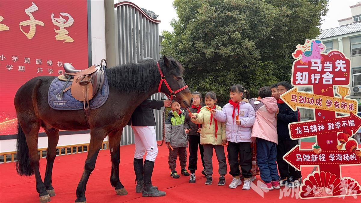 湖北日报讯(记者张倩倩)3月4日清晨,武昌区未来实验小学黄鹤楼校区红毯尽头,一匹骏马踏着碎步而来。孩子们踮脚伸颈,惊呼连连:“哇,是真的马!”这是学校特意安排的“骏马贺岁”互动。专业骑手驾驭骏马绕场,各年级学子挥臂高呼:“一马当先向前闯!”