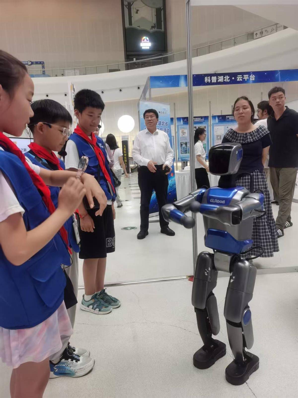 小学生与人形机器人互动。(湖北日报全媒记者包东喜摄)