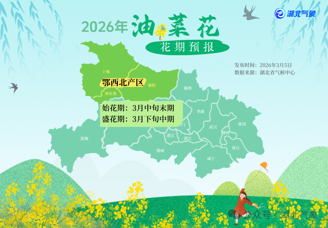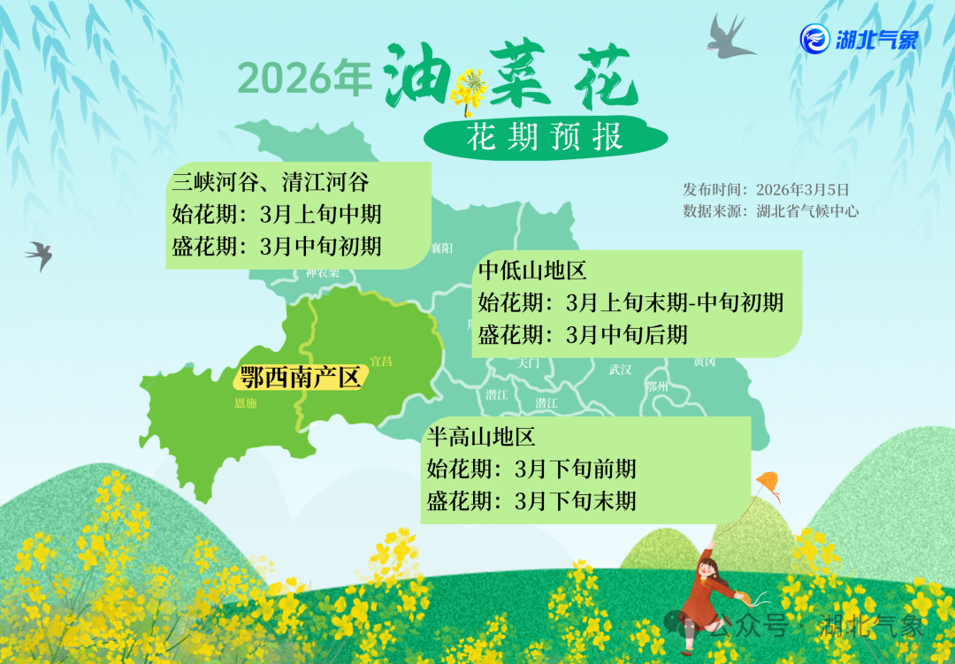 鄂西北产区:油菜3月中旬末期进入始花期,下旬中期进入盛花期。