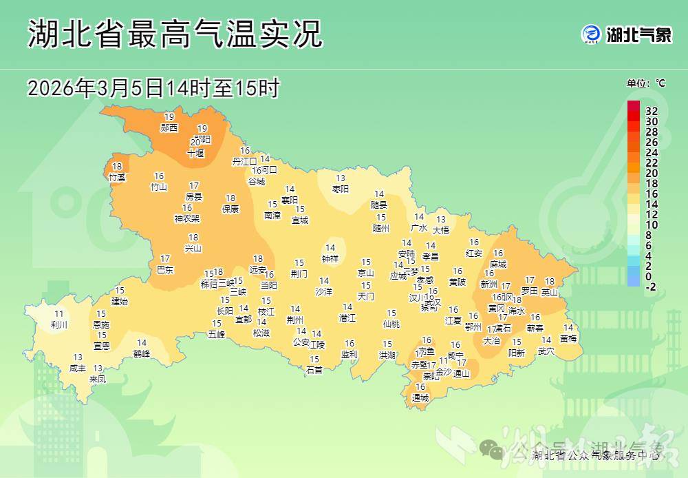 5日白天,西部地区出现短时小雨,不过对气温的影响不大,15时大部地区气温14至19℃,十堰国家站气温达到了20℃。受高空弱波动影响,未来三天湖北多弱降水,预计6日鄂西部分地区有小雨,其他地区阴天到多云。7日降雨范围覆盖全省,鄂西南有小到中雨,其他地区多云转小雨。8日北部地区转阴南部仍有降雨。未来三天中东部地区气温变幅不大,鄂西地区气温下滑明显,如十堰最高气温将从5日的20℃跌至10℃以内。