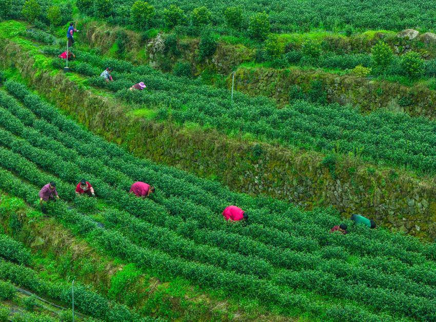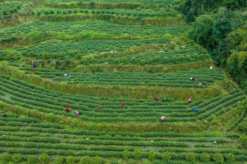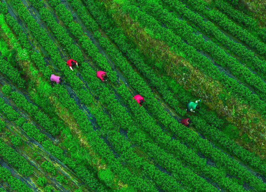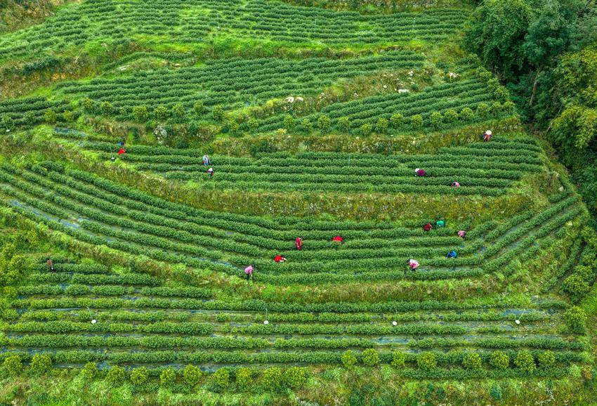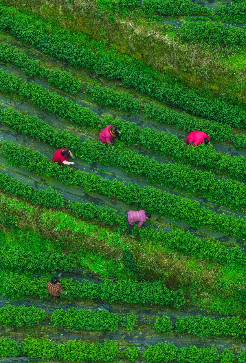 图为3月5日,湖北省秭归县茅坪镇建东村村民在御子堂生态茶园除草,为采茶做准备(无人机照片)。