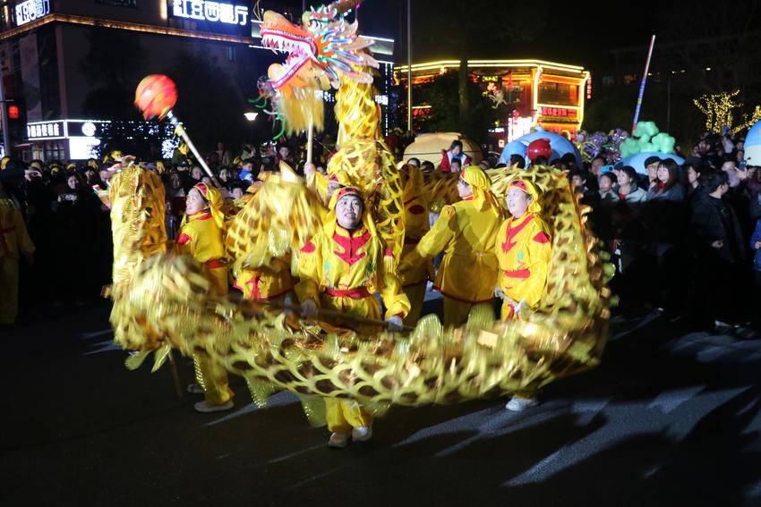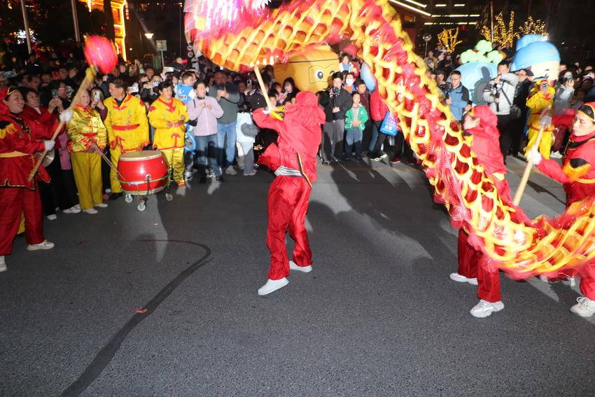 国风花灯秀,一秒穿越古今,龙狮劲舞,民俗巡游大联欢。从水务集团到洪广广场再到才智广场,道路两旁、树枝之上挂满主题花灯。夜幕降临,万灯齐亮,市民仿佛漫步在光影交错的古意长廊。地道的舞龙、舞狮、采莲船、蚌壳精、连厢舞、马车舞、财神爷、毕昇妙音、鱼灯、元宵灯谜应有尽有,还有毕昇活字印刷体验,人头攒动、人山人海,一场集民俗、国潮、趣味、互动于一体的元宵文化盛宴吸引成千上万的市民前来观看,现场人潮涌动,热闹非凡。(湖北日报客户端通讯员 付向阳)