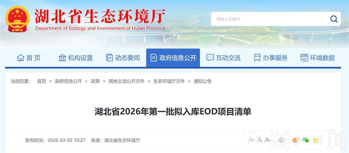 湖北日报讯(记者刘郸、通讯员李斌)3月5日,省生态环境厅官网发布《湖北省2026年第一批拟入库EOD项目清单》,武汉市武昌区环沙湖双碳经济带EOD项目、“云雾茶乡,泉润英山”生态环境导向的开发(EOD)项目(一期)、张湾区水环境综合整治与低空产业融合发展EOD项目、孝南区肖港镇天紫湖区域水生态环境治理与绿色产业融合发展EOD项目、湖北省安陆市洑水港河生态环境治理与高新技术产业融合开发EOD项目等5个项目入选。