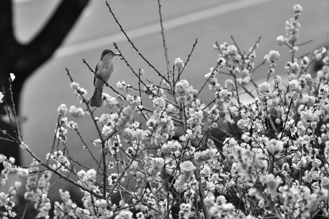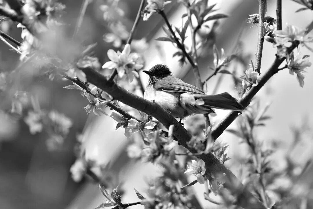 鸟儿在花丛间驻足、啁啾鸣啭,