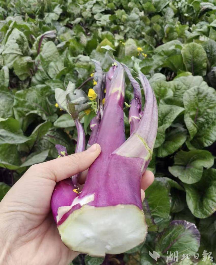 放眼望去,500亩“洪山菜薹”紫浪翻滚、蔚为壮观。