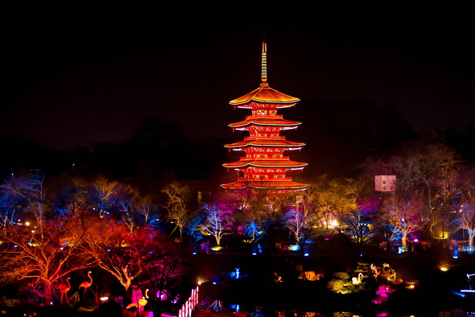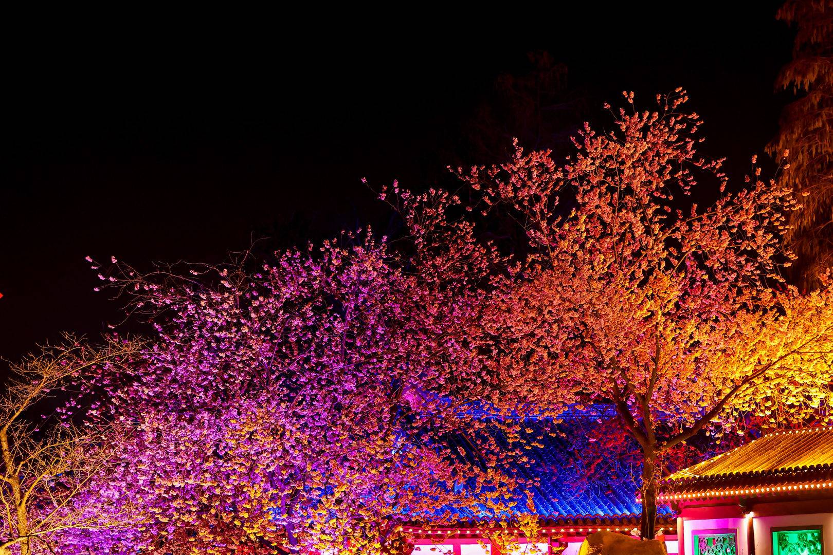 东湖樱花园以樱花为核心,兼具中式园林的雅致意境。当夜幕降临,樱花园便切换至梦幻模式。完善的灯光亮化工程依托现代科技,为满园樱花披上璀璨华裳。