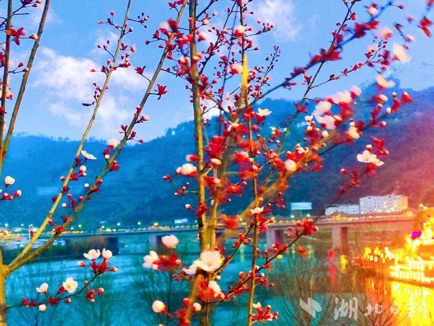 清澈的堵河水倒映着漫天雪白花影,花在水中开,水在花间流,山水花影交融,如同一幅灵动的水墨画卷。