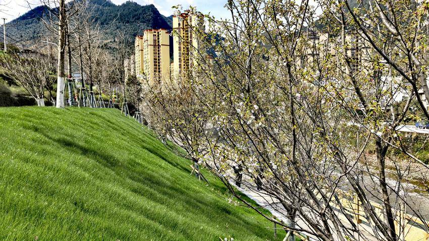 鸡公洞亲水走廊地处容美城区核心地段,背靠连绵青山,面临清澈河道,周边高楼林立却又不失自然野趣。此次樱花盛开,更是将“山、水、城、花”四大元素完美融合——远处山峦叠翠,近处樱花似雪,脚下绿草如茵,身旁流水潺潺,现代建筑与自然景观和谐共生,展现出鹤峰县城独特的生态魅力。