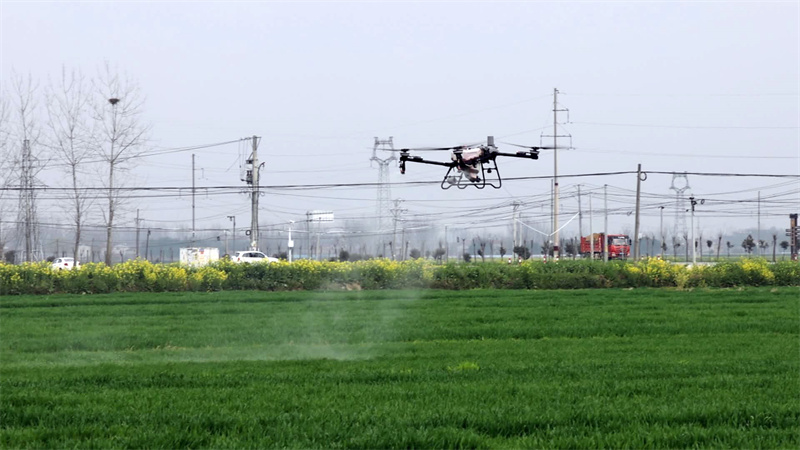 3月6日,在郑集镇童梅村一处小麦基地,一台植保无人机正在麦田上空来回穿梭,开展“飞防”作业,为田间小麦披上一层安全“防护衣”。
