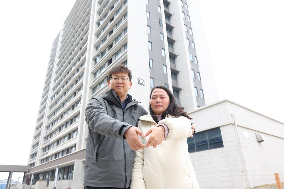 邹祥与妻子卞小亚在员工公寓楼前合影