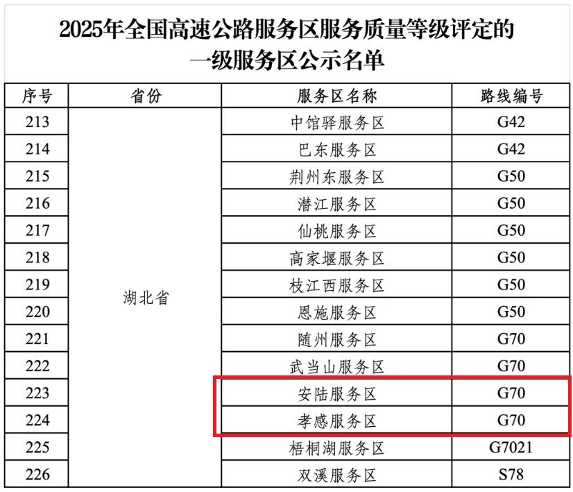 近日,交通运输部公示2025年全国高速公路服务区服务质量等级评定一级服务区名单,孝感境内的福银高速(G70)孝感服务区、安陆服务区双双入选。