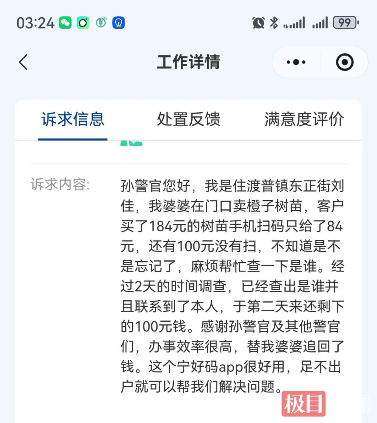 刘女士的婆婆在渡普镇东正街摆摊售卖橙子树苗,一笔184元的交易后,盘点时发现仅到账84元,少付的100元虽不多,却是老人摆摊的辛苦所得。情急之下,刘佳想到了“宁好码”,足不出户就提交了求助诉求,满心期盼能得到帮助。