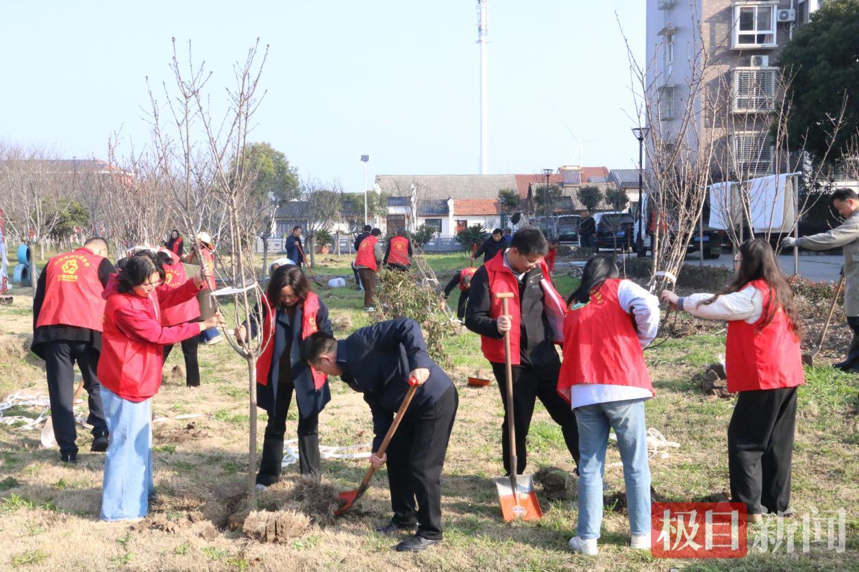 当天上午,樱花谷一片热火朝天,参加植树的志愿者三五人一组,分工协作,配合默契。此前,农场提前挖好树坑,大伙将刚运到的樱花树苗小心放入坑中,然后回填土壤。大家干劲十足,有人挥锹铲土,有人取水浇灌……现场井然有序。