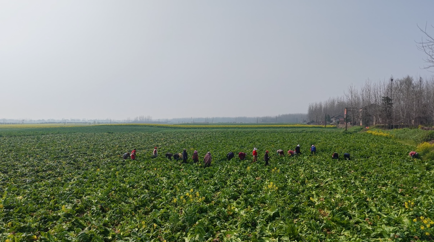 湖北日报客户端讯(通讯员陈子阳、彭涵熙)人勤春来早,农事正当时。在石首市高陵镇晏家巷村600亩的芥菜种植基地,连片种植的芥菜茎白叶绿、长势喜人,村民们正抢抓晴好天气采收芥菜,田间地头一派繁忙的丰收景象。